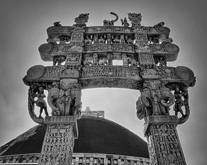 Sanchi stupa gate in black and white
