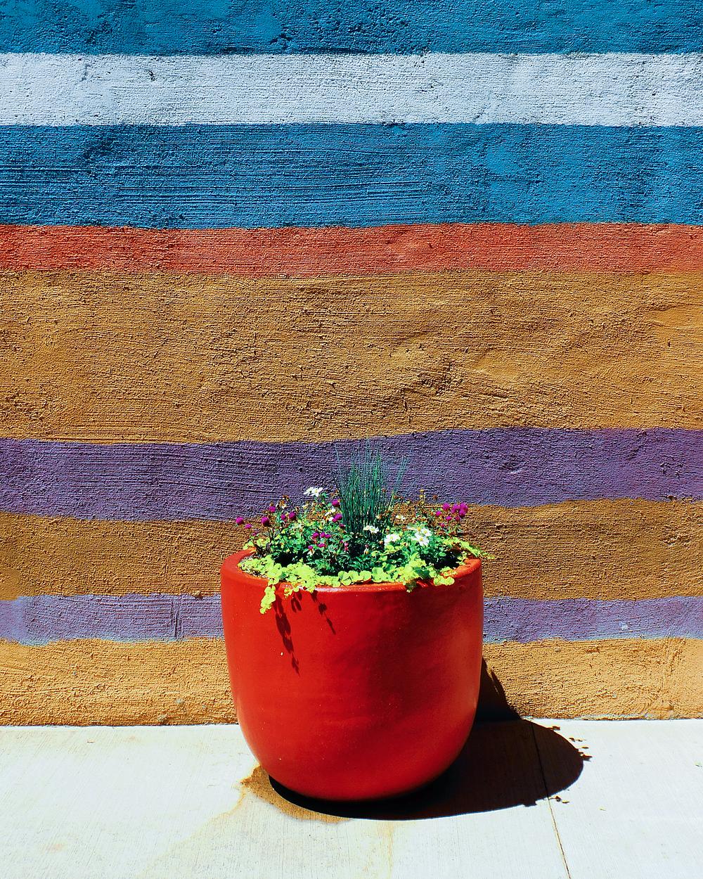 Taken in Albuquerque, New Mexico, this picture of a flower pot against a colorful adobe wall showcases the colors and culture that is traditionally New Mexican.