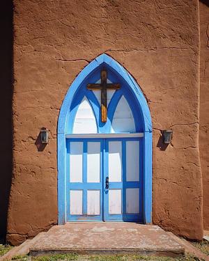 Blue and white door against classic adobe that epitomizes the culture of New Mexico. The San Rafael church is located in La Cueva.